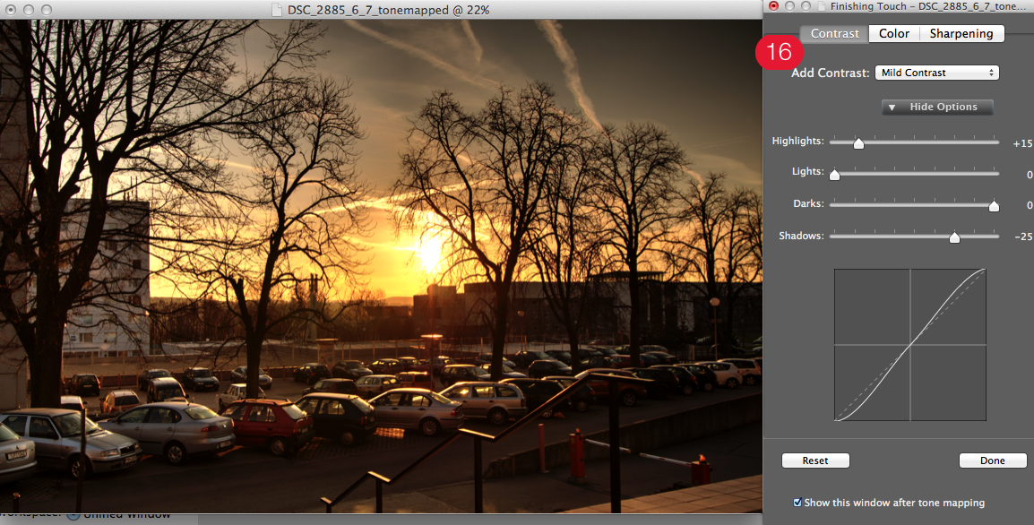 Nakonec lze ještě doladit drobnosti (16) jako je barva, kontrast, ostrost, ořez a jiné. Vedle již vidíte hotovou fotografii, kterou stačí uložit stisknutím kombinace CMD + Shift + S.