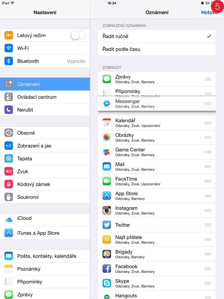 Celý proces je velice jednoduchý. Stačí přejít do Nastavení (1), vybrat Oznámení (2) a v oddělení zaškrtnout Řadit ručně (3). Následně stisknout Upravit (4), a už pouze přesouváte aplikace na místo, které chcete. Jakmile máte vše podle svých představ, tak stačí ťuknout na Hotovo (5), a už se vám notifikace budou zobrazovat ve vámi zvoleném pořadí.