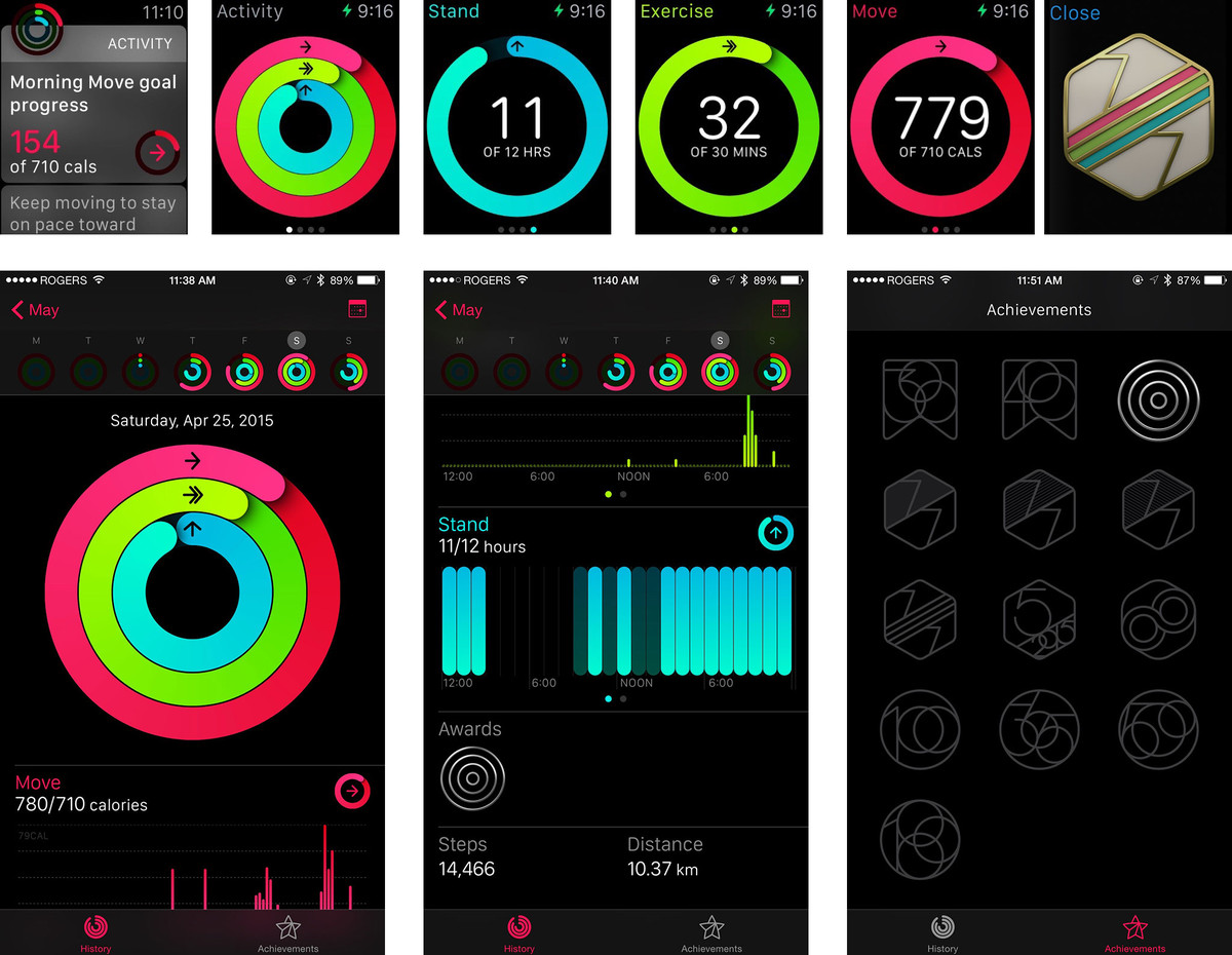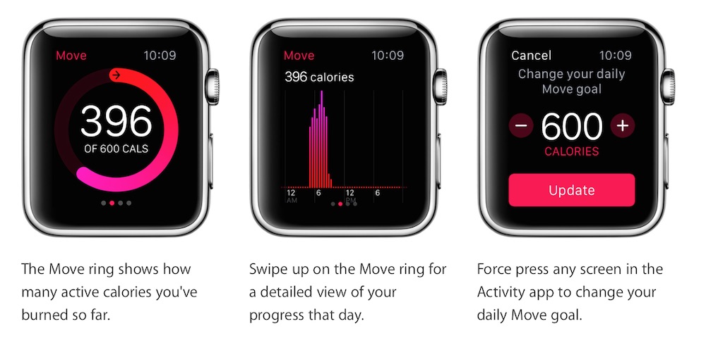 Aktivita měří už zmíněný počet kalorií; počet minut věnovaných cvičení a počet hodin, které jste během dne neproseděli.