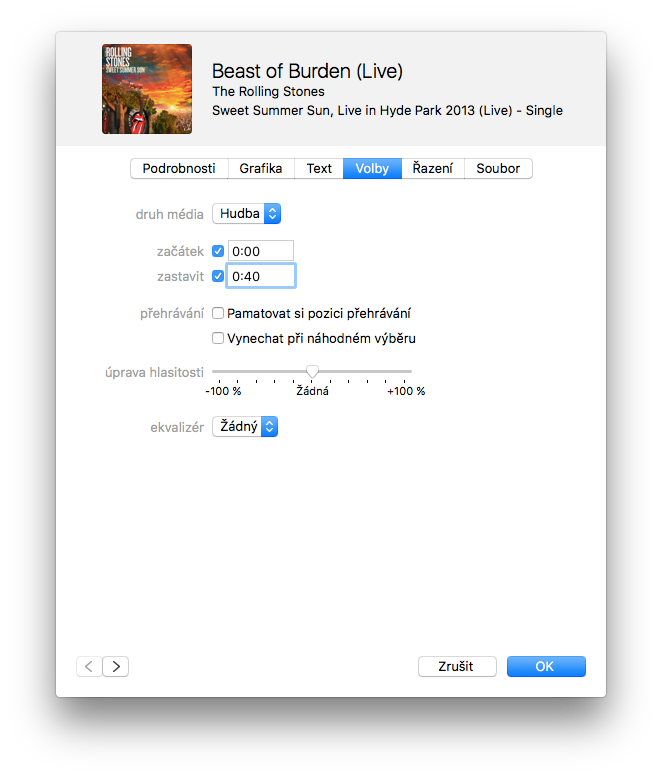 Když se pro některou ze skladeb rozhodnete, vyvolejte nad ní sekci informace. Zde zaškrtněte volby a nastavte začátek a konec jedné z pro vás nejoblíbenějších částí tak, aby maximální délka činila 40 vteřin. Pak klepněte na OK. I když se to na první pohled nezdá, v okamžiku, když nyní skladbu pustíte, bude hrát pouze ta její část, kterou jste navolili.
