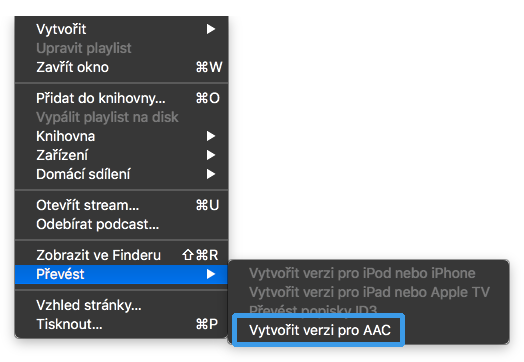 Nyní máte za sebou první krok. Následně danou skladbu označte. Vyvolejte si nabídku Soubor a zde v podnabídce Převést potvrďte možnost Vytvořit verzi pro AAC. Dojde k duplikování prvně vybrané skladby nyní už v požadované délce a ve formátu m4a. Doporučuji vrátit se k původní skladbě a v informacích, část Volby zrušit předtím nastavenou zkrácenou délku.