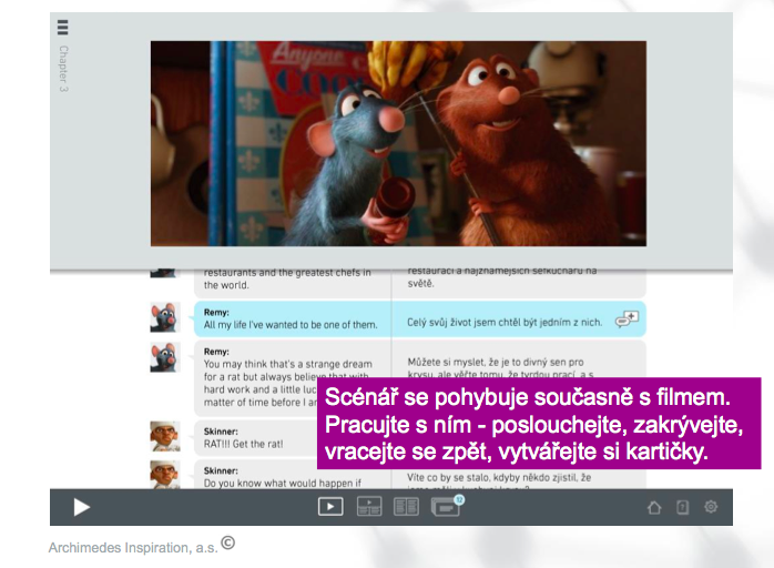 Jazyky se dají učit i zábavně! Důkazem je světová novinka ArchimedesCool, výuka jazyků s filmy. Vaším novým učitelem se stane John Travolta nebo jiný oblíbený herec. Z filmů ArchimedesCool si vybere každý, od dětí po seniory. S ArchimedesCool nebudete jen sledovat filmy s titulky, ale budete mít co do činění s rafinovaně propracovanou interaktivní metodou. Film můžete kdykoliv zastavit, s obrazem si můžete číst dvoujazyčný scénář, na speciální opakovací kartu si můžete zapsat věty, které vám nepůjdou… Je to jednoduché, zábavné, dostupné a vhodné pro všechny.