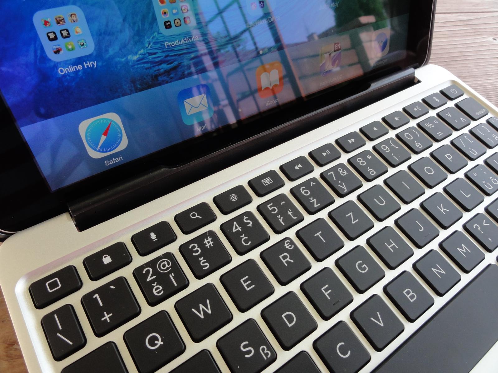 Kloub, který drží oba díly pospolu, drží oba díly pevně, dá se přitom ale i polohovat. Záleží tedy jen na vás, jaký jeho úhel si pro optimální práci potřebujete nastavit. Navíc se jedná o zařízení 4 v 1, takže vám stačí otočit si iPad displejem na druhou stranu od klávesnice, a získáte tím praktický stojánek např. při sledování videí. Klávesnice je z hliníku a do elegance si nic nezadá s tou jablečnou na MacBoocích. Na spodní straně má gumové proužky, aby vám při práci nejezdila po stole. Její použitý materiál se ale projeví i na celkové váze klávesnice. Díky jejím rozměrům vypadá jako střízlík, když ji ale pozvednete, překvapí vás.
