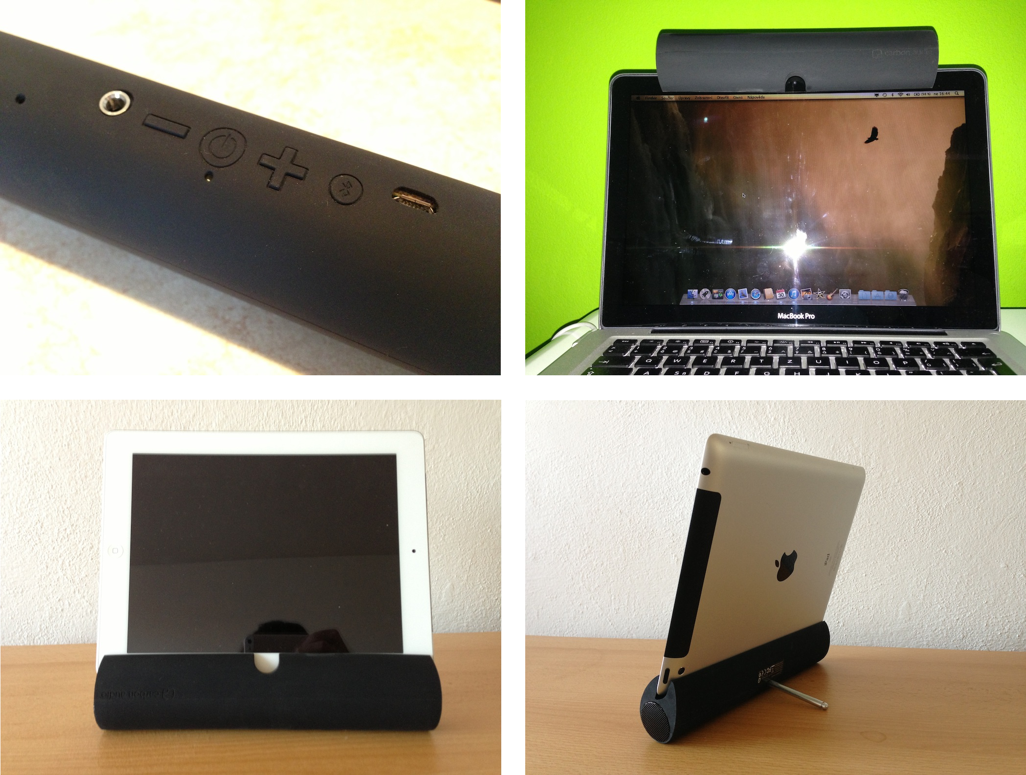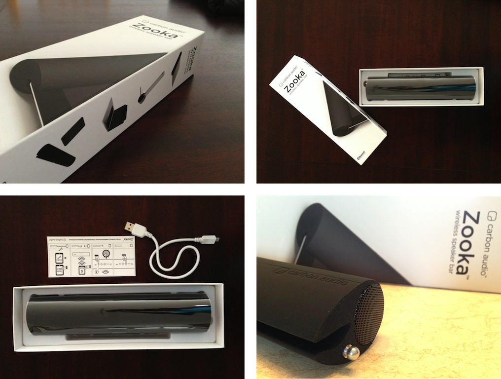 Na horní části jsou ovládací prvky v podobě zapínacího tlačítka, bluetooth a ovládání hlasitosti. Vedle se nachází audio konektor 3,5 mm, mikrofon a microUSB, přes který se reproduktor nabíjí. Na spodní straně je praktická drážka, do které můžete zasunout iPhona, iPad nebo nasadit na hranu MacBooku. Díky pogumování na ní pevně drží a samovolně nesklouzne. Drážka má uprostřed vyříznutou díru, aby nedošlo k zakrytí kamery při nasazení na MacBook. Zooka se může použít i jako stojan mobilního zařízení. Je k nim přiložen kovový nástavec, který se našroubuje na zadní stranu a slouží jako podpěra.