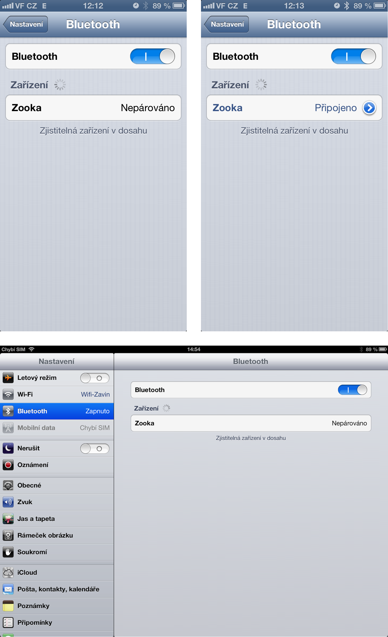 Připojení k zařízení je velmi jednoduché, stačí Zooku zapnout, stisknout na 3 vteřiny Bluetooth tlačítko a pak iPhone, iPad či Mac s reproduktorem spárovat. Po dobu připojení je na iPhonu a iPadu automaticky používán jako primární audio výstup. Na MacBooku si musíte zvolit, jestli chcete použít Zooku, protože po připojení zůstanou vestavěné reproduktory jako primární audio výstup.